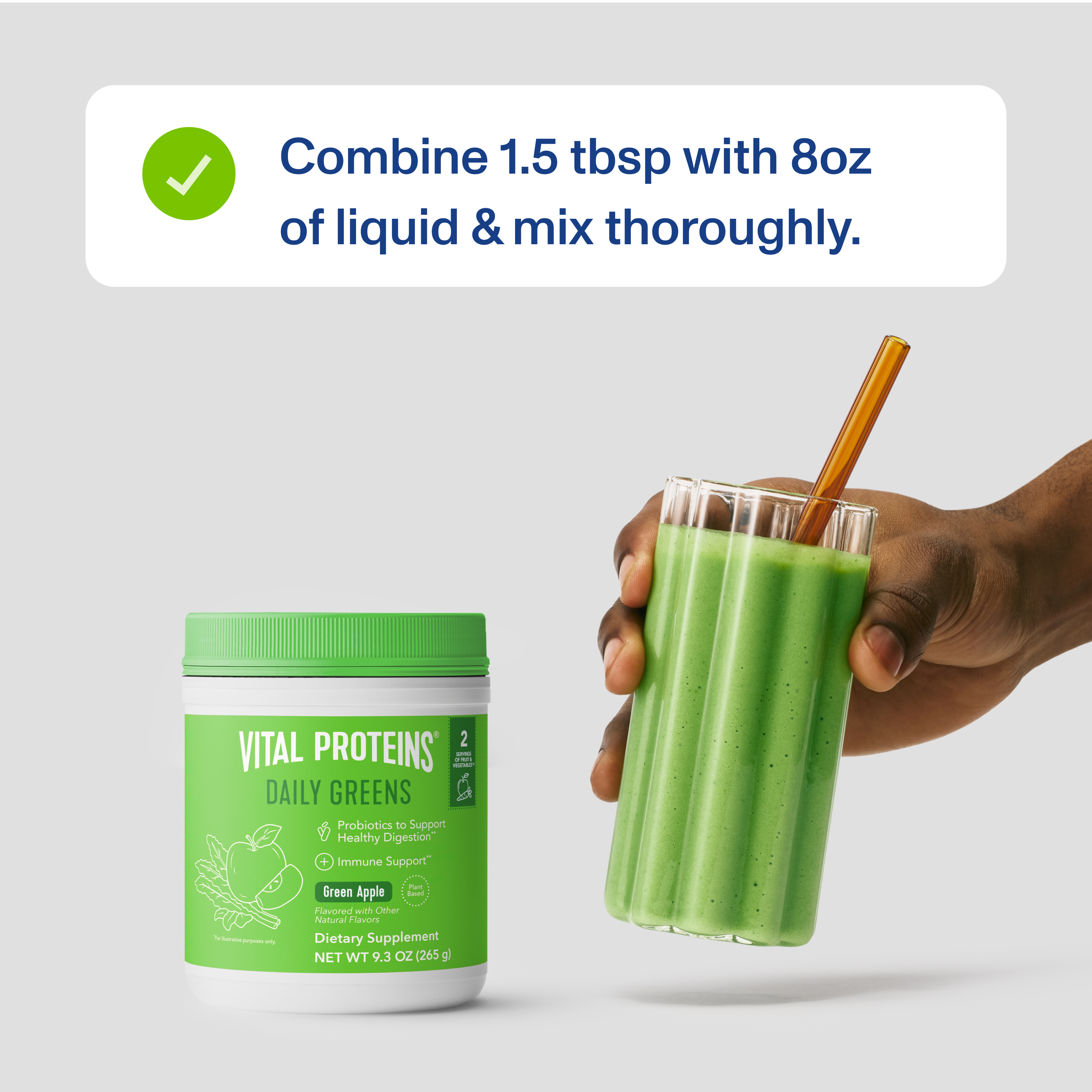 Getting Your Greens Just Got Tastier! Introducing Vital Proteins® Daily Greens, this powerful, nutrient-rich blend contains two servings of fruits and vegetables^, and probiotics for immune and digestive support —all with a refreshing taste.