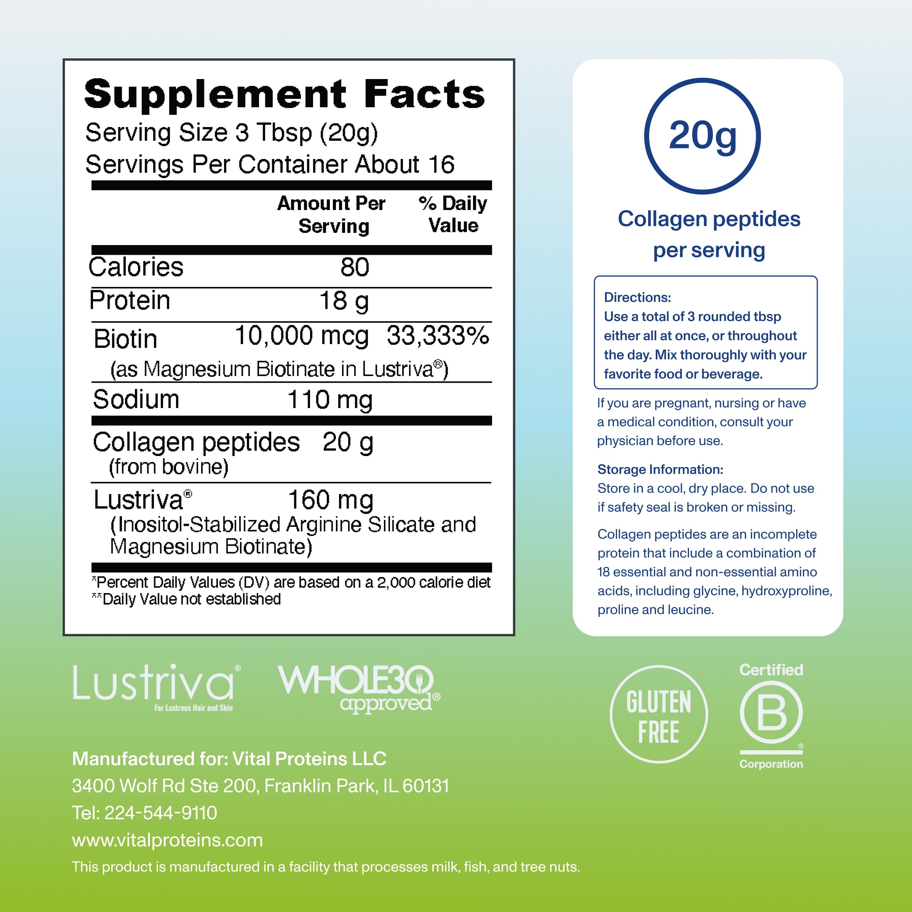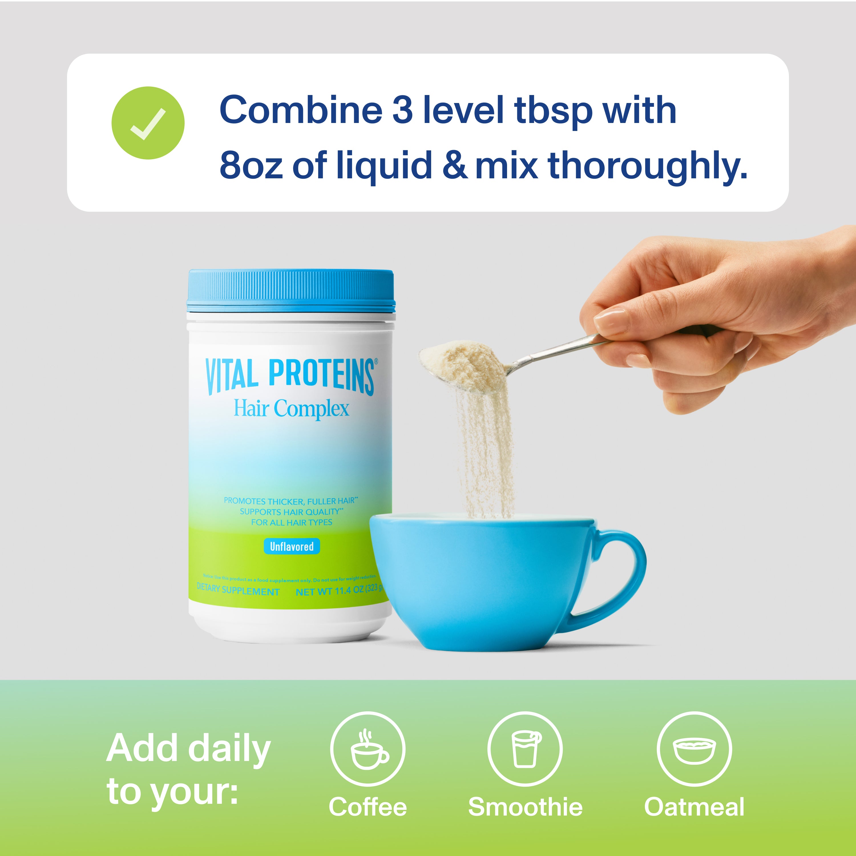Vital Proteins Hair Complex is an unflavored powder that helps grow thicker, fuller hair in 12 weeks. No need to take vitamin capsules to support hair growth, our powder nourishes from within.