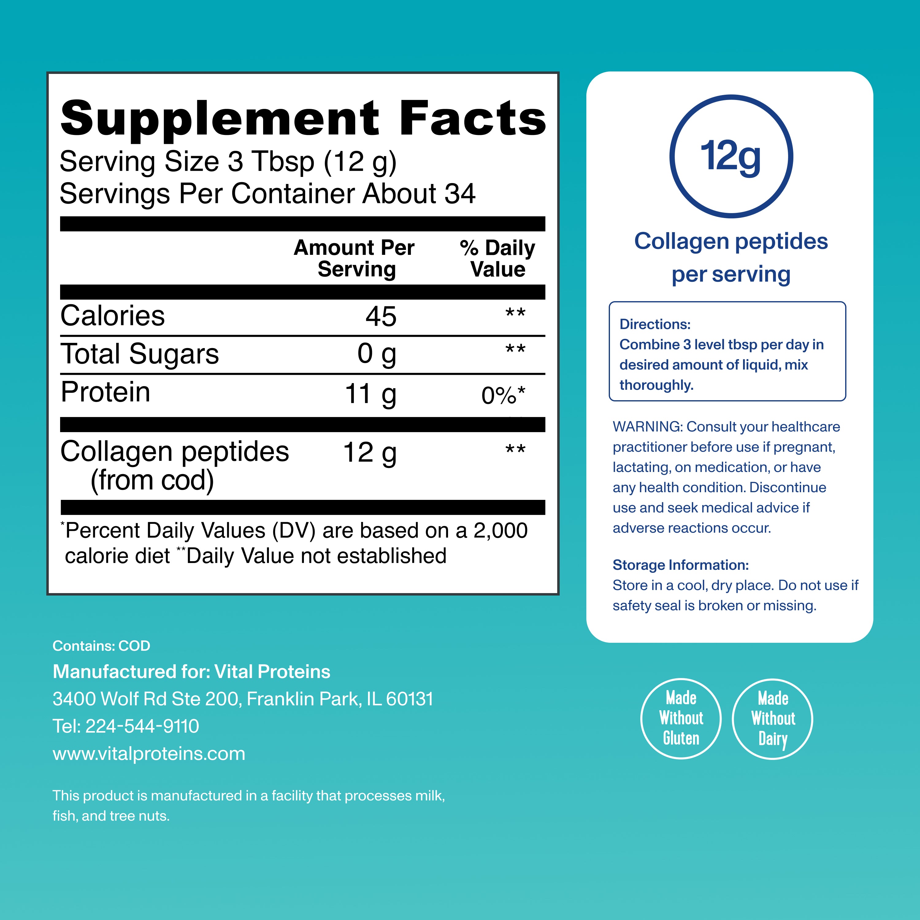 Vital Proteins® Marine Collagen contains 12g of collagen peptides per serving and is made from the scales of non-GMO Certified, wild-caught cod. It’s highly bioavailable and digestible.