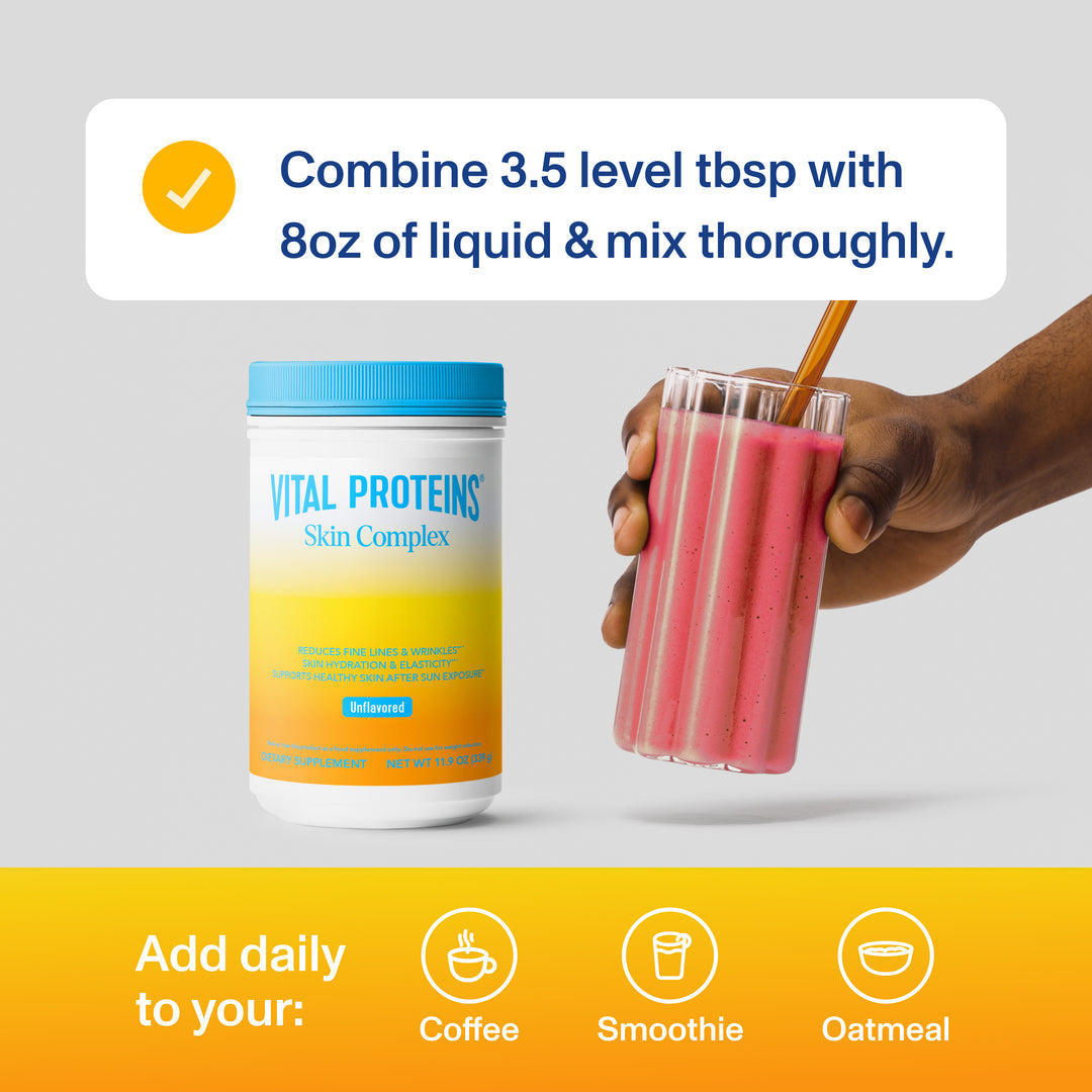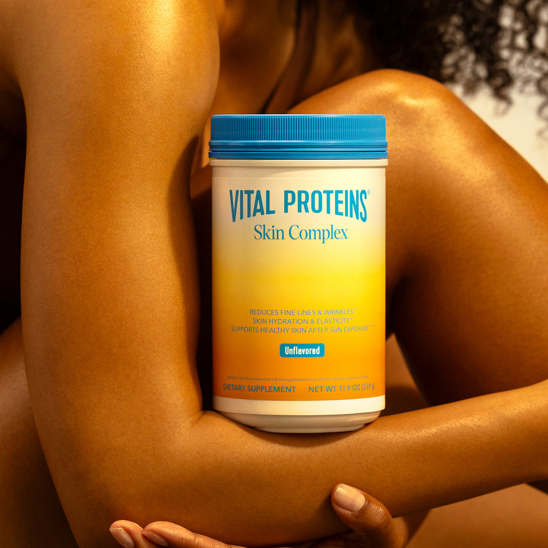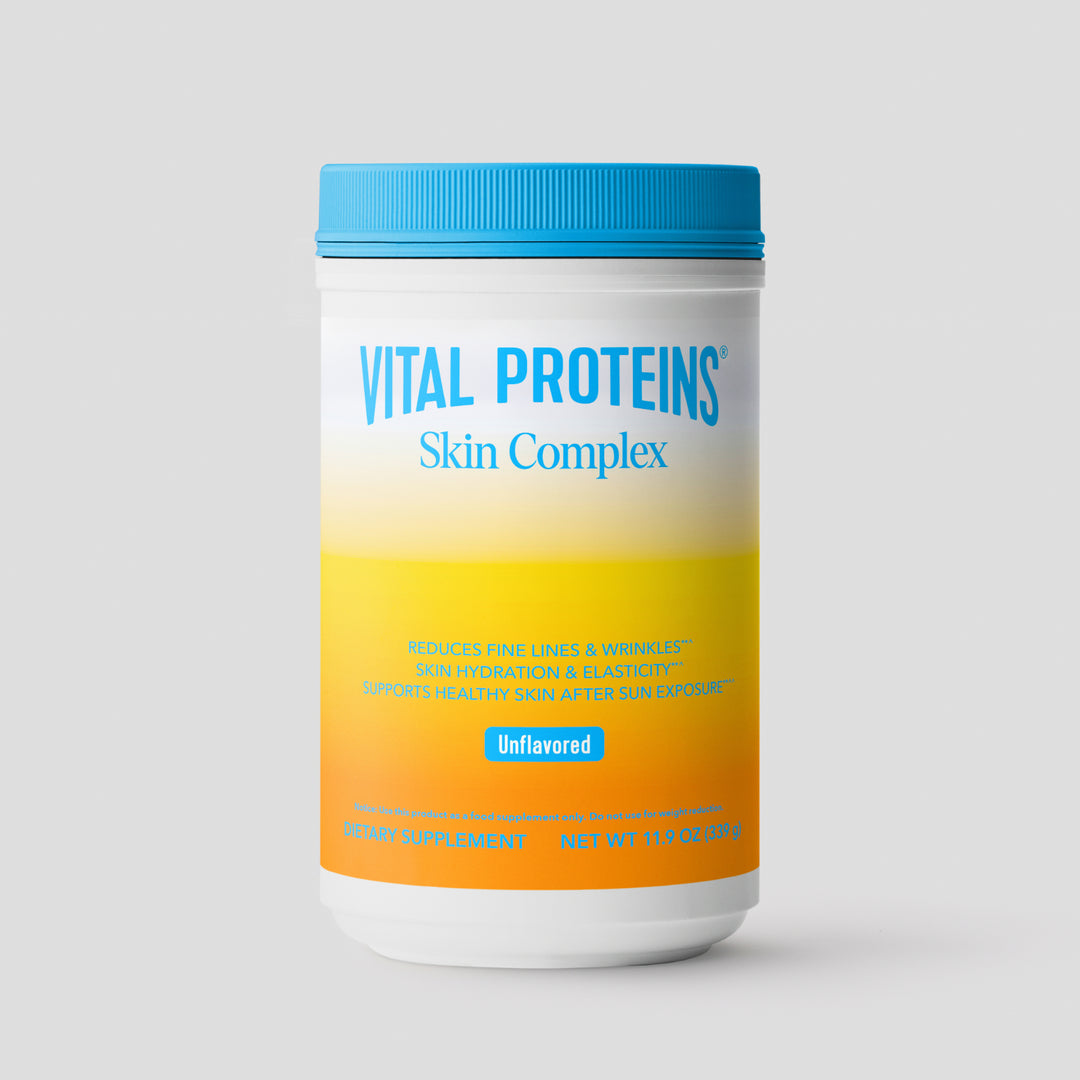 Vital Proteins Skin Complex is a unique blend of Vital Proteins Unflavored Collagen Peptides, Holimel Melon and the nourishing antioxidants Hyaluronic Acid and Vitamin C that supports healthy skin from within as the perfect complement to SPF in your skincare routine.^**
